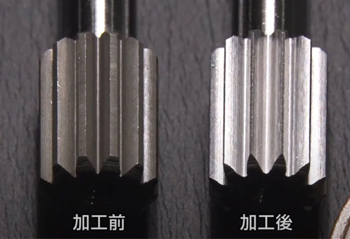 世界的高水準の加工精度を誇るライスハウァー社の最新歯車歯研切削盤へ工作機械を変更して製造。研削砥石や加工条件等の検証・改善を繰り返し、1μm以下の誤差で製造される超高精度歯車を実現。実際の製品に組み込まれ、音の問題をクリアした滑らかな動きとなりました。