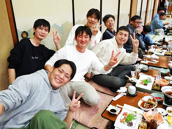 冬は忘年会を毎年開催。業務終了後にバスに乗り込み、三谷温泉へ。宿泊先も会社で用意し、大忘年会が始まります。ビンゴ大会では豪華景品を用意して全社員に当たるようにしているので、とても盛り上がります。